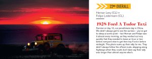 Hernán and Felipe made the decision to participate in a 1928 Ford Model A Taxi, since older classes have a better chance of being accepted to race. The car is also a very reliable option with a large stock of spare parts in the market. They prepared the car during the pandemic according to the rally organisation’s regulations, and before P2P, carried out extensive tests on different terrains. This included a 5,000 kilometre journey crossing the Andes Mountains at more than 4,800 metres high, enduring sandstorms and temperatures of more than 40 degrees in Argentina.